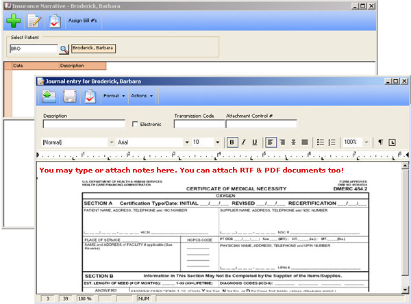 In today's insurance environment, doctors often need to add an insurance narrative, such as Certificate of Medical Necessity, for certain types of claims. MedOffice allows you to link a specific claim with its narrative, as shown here. You can type notes and attach to any claim detail line!